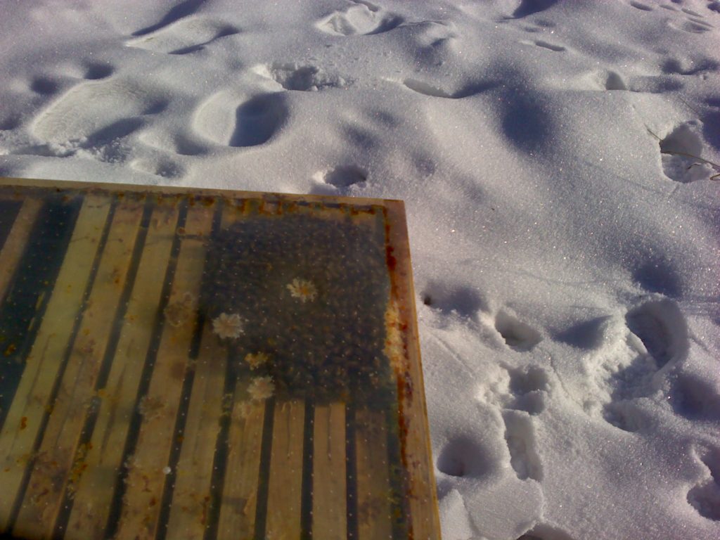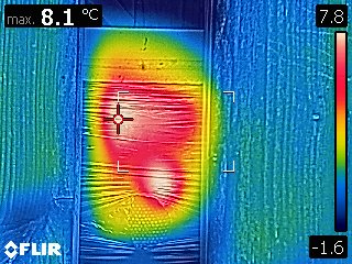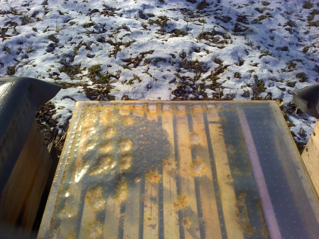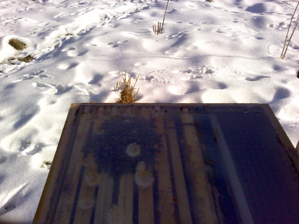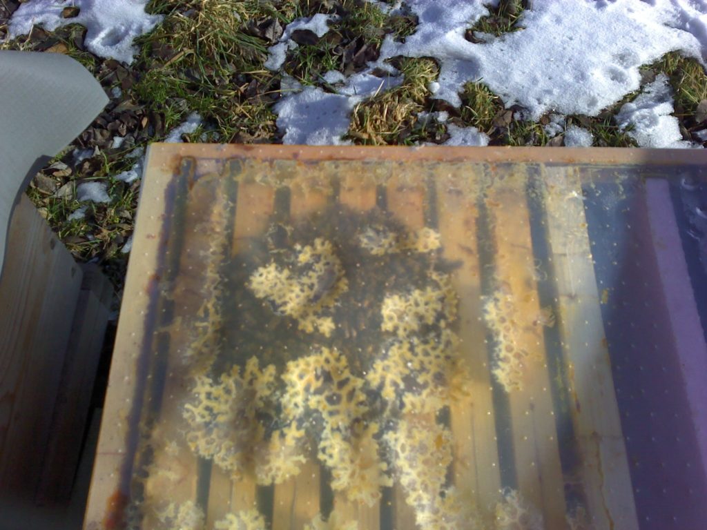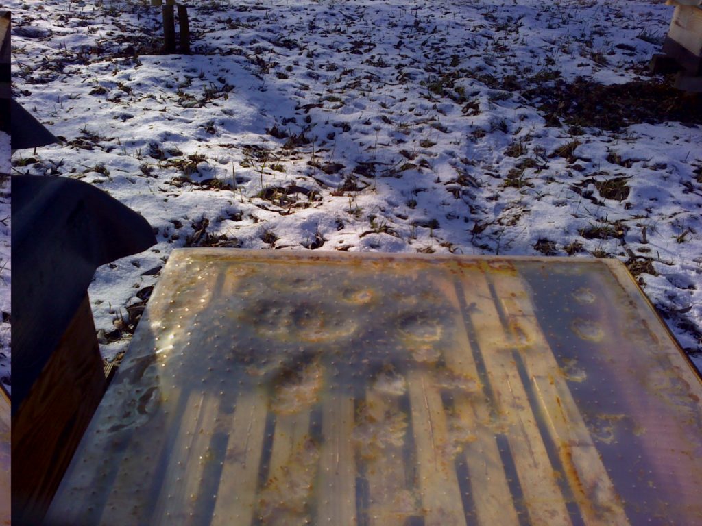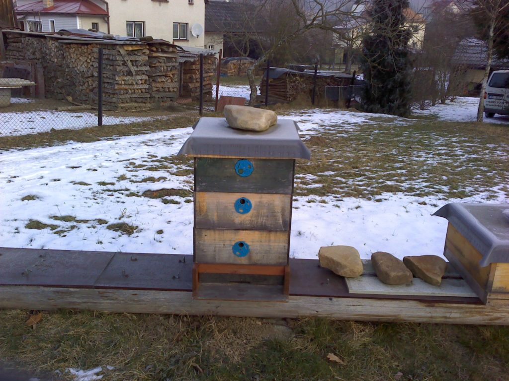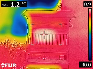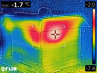 Datum: 26. ledna 2020, čas: 10hod., teplota: -4 až -1 stupňů. Prošel jsem si 4 stanoviště od 400 do 600m.n.m. se zapůjčenou termokamerou Flir E60 a včelstva v otevřeném úlu jsou na 6-8 uličkách. Sýkorky si ráno pozbírají mrtvolky pod rámky na sítu a s podložky přečtete zbytek, takže nic čistit nemusíte. Zpětně když zhodnotím rok 2019 tak těch 12 včelstev které mám v otevřeném úlu mi dalo průměrně stejně medu jak ostatní. V sezoně byly silnější, zase toho víc přetopily a prokazatelně proplodovaly než ty, které jsem si vytipoval na začátku sezony a s němi to srovnával. Loupeže nejsou (to je ale o metodice), byť některé v řijnu loupily a to jsem poznal na váze. Včelstva jsou delší dobu bez plodu a to beru jako velké plus. Všechna ostatní včelstva mám v tenkostěnných 22mm úlech na otevřeném – celozasíťovaném dně. Ještě z dob dávných mám zateplené Langy 2/3 – 4cm styrodur, které používám jako plemenáče a jak je vidět na kameře, už plodují… takže letos naposledy a dám si tu práci na podzim a půjdou pěkně do dřeva. Naštěstí jsem žádný prázdý úl nenašel, ale do jara ještě nějaký čas máme, takže bych to nechtěl zakřiknout… Co jsem ale našel, tak 3 včelstva začala zimovat uprostřed rámku a dochází jim zásoby, takže do 14 dnů to projdu všechno a buď přihodím zásobní rámky, nebo těsto – tady se rozhodnu jaké bude aktuálně počasí a jeho předpokládaný výhled.