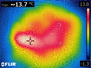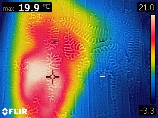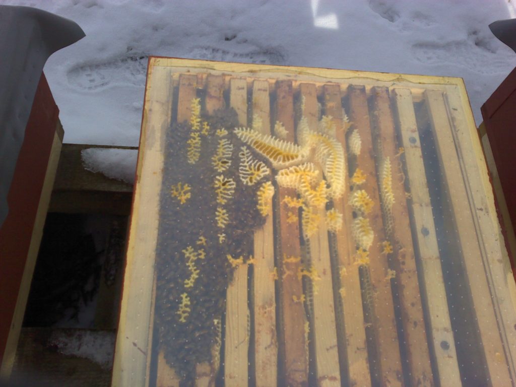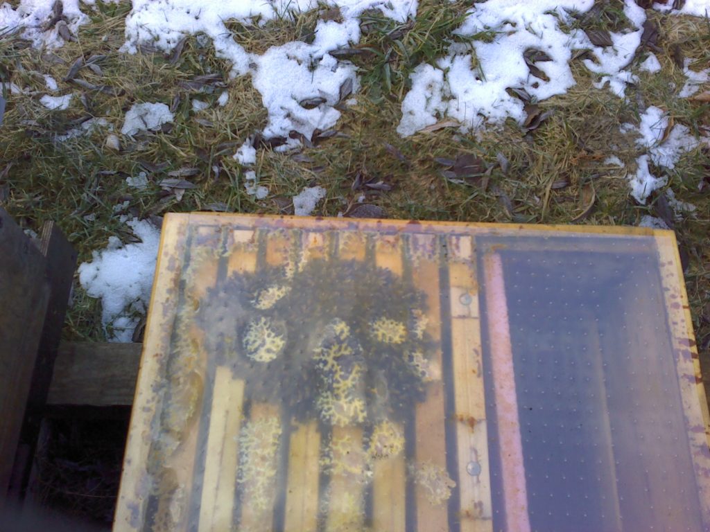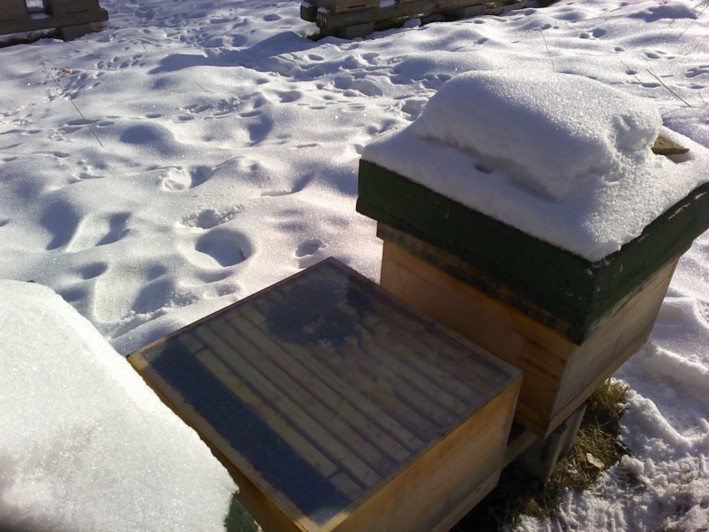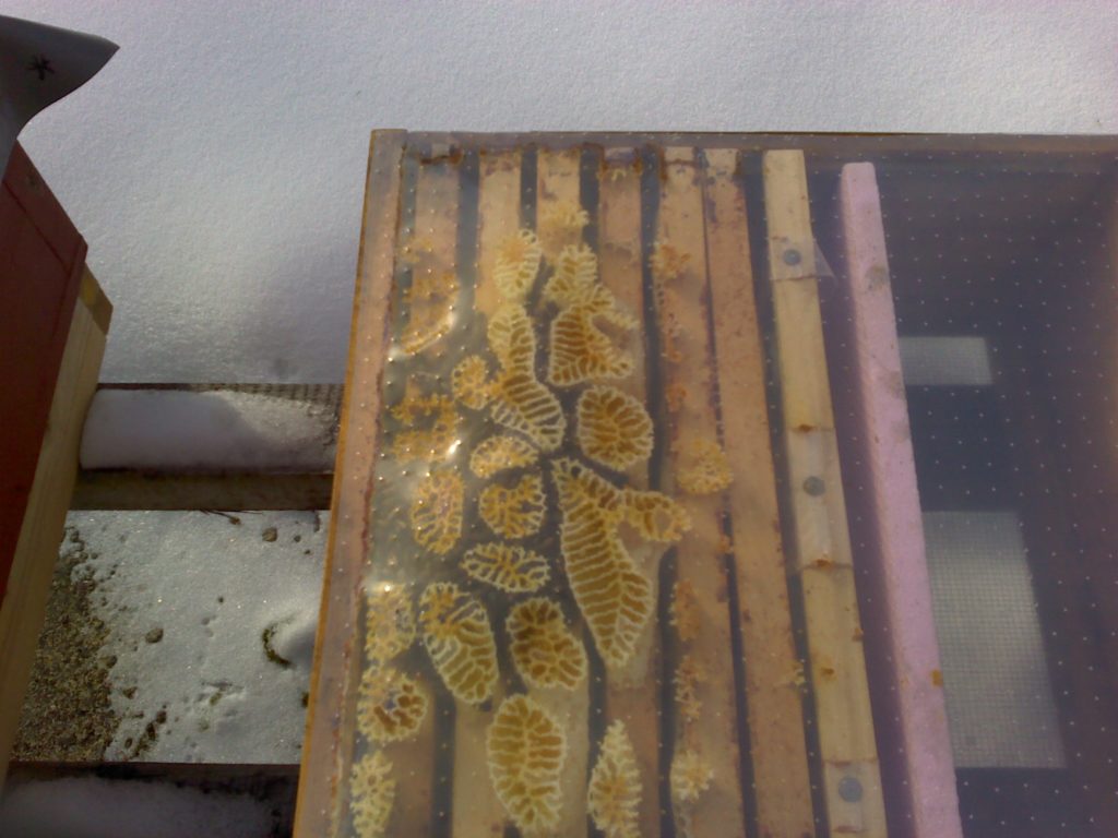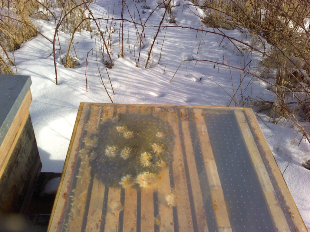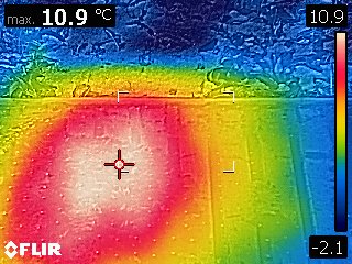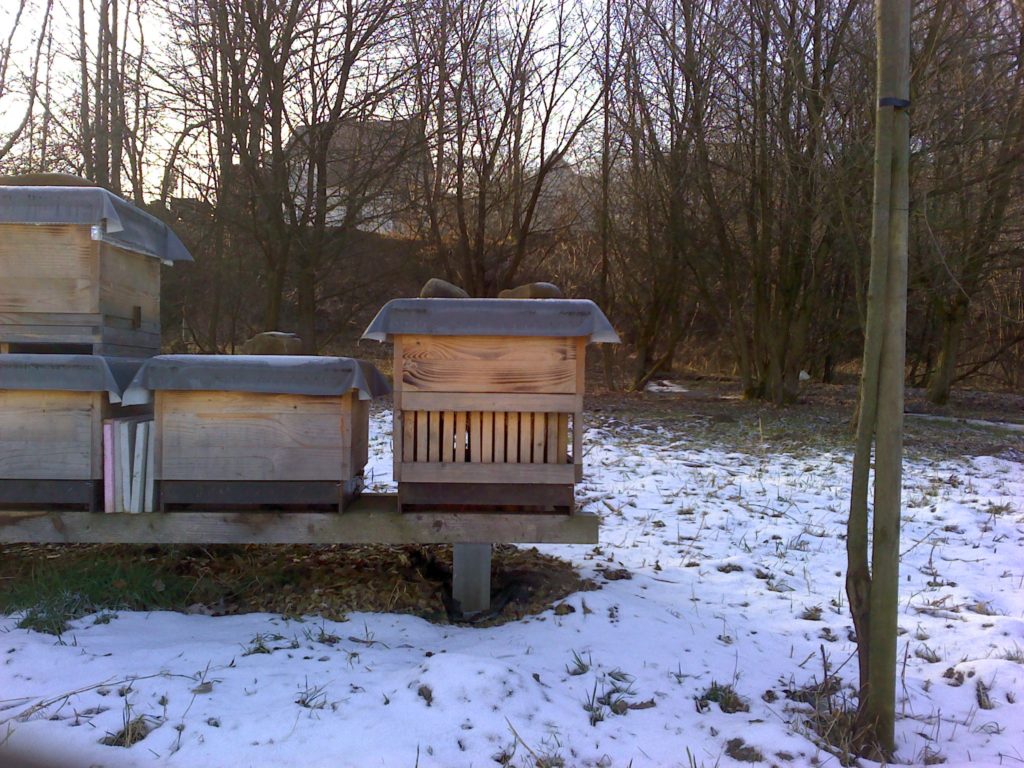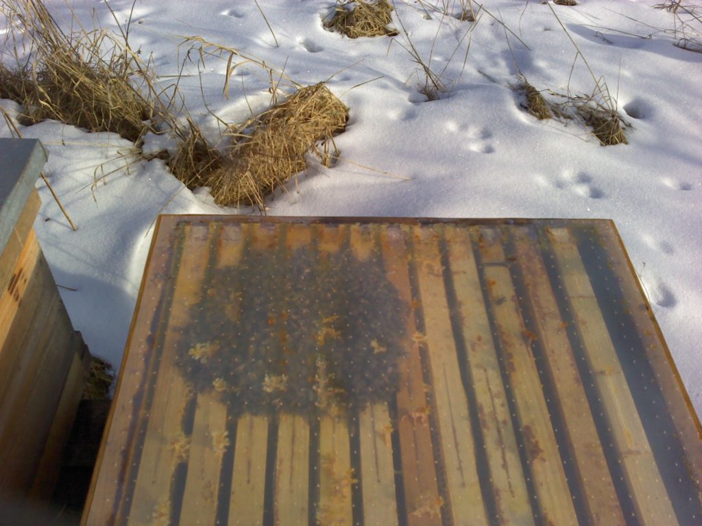 Datum: 26. ledna 2020, čas: 10hod., teplota: -4 až -1 stupňů. Prošel jsem si 4 stanoviště od 400 do 600m.n.m. se zapůjčenou termokamerou Flir E60 a včelstva v otevřeném úlu jsou na 6-8 uličkách. Sýkorky si ráno pozbírají mrtvolky pod rámky na sítu a s podložky přečtete zbytek, takže nic čistit nemusíte. Zpětně když zhodnotím rok 2019 tak těch 12 včelstev které mám v otevřeném úlu mi dalo průměrně stejně medu jak ostatní. V sezoně byly silnější, zase toho víc přetopily a prokazatelně proplodovaly než ty, které jsem si vytipoval na začátku sezony a s němi to srovnával. Loupeže nejsou (to je ale o metodice), byť některé v řijnu loupily a to jsem poznal na váze. Včelstva jsou delší dobu bez plodu a to beru jako velké plus. Všechna ostatní včelstva mám v tenkostěnných 22mm úlech na otevřeném – celozasíťovaném dně. Ještě z dob dávných mám zateplené Langy 2/3 – 4cm styrodur, které používám jako plemenáče a jak je vidět na kameře, už plodují… takže letos naposledy a dám si tu práci na podzim a půjdou pěkně do dřeva. Naštěstí jsem žádný prázdý úl nenašel, ale do jara ještě nějaký čas máme, takže bych to nechtěl zakřiknout… Co jsem ale našel, tak 3 včelstva začala zimovat uprostřed rámku a dochází jim zásoby, takže do 14 dnů to projdu všechno a buď přihodím zásobní rámky, nebo těsto – tady se rozhodnu jaké bude aktuálně počasí a jeho předpokládaný výhled.